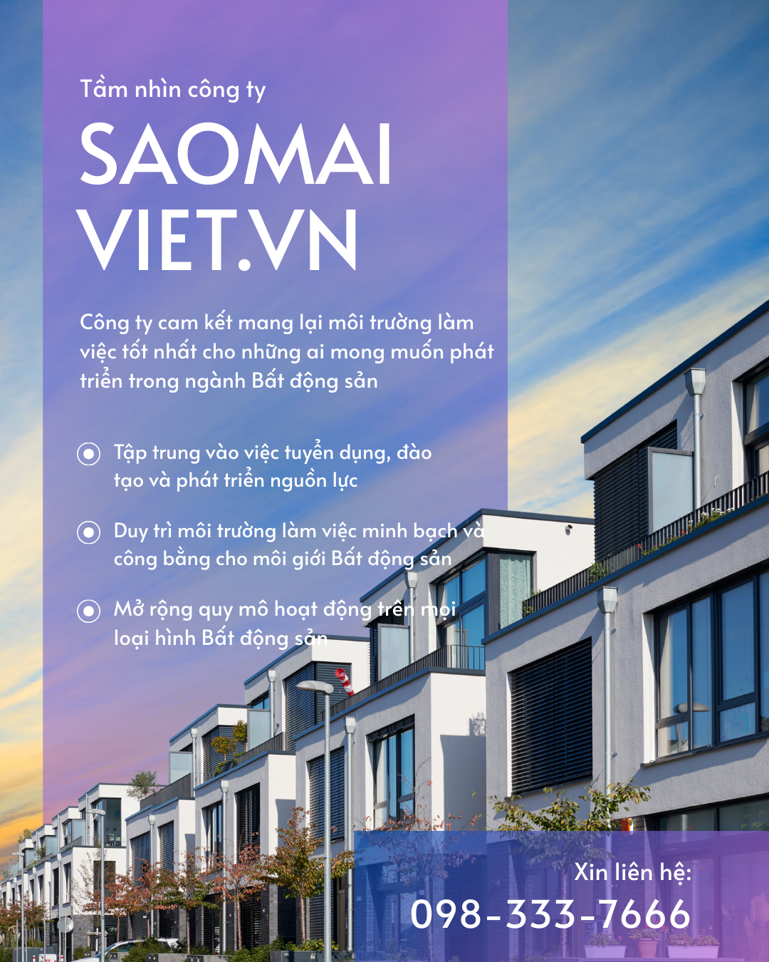 Trong bối cảnh thị trường bất động sản đầy biến động, Sao Mai Việt nổi lên như một đơn vị tiên phong, mang trong mình sứ mệnh kết nối khách hàng và chủ nhà, đồng thời cung cấp các giải pháp mua bán bất động sản hiệu quả và an toàn. Chúng tôi kiến tạo một môi trường làm việc lý tưởng cho đội ngũ nhân viên, đào tạo thế hệ môi giới chuyên nghiệp, và giúp hàng ngàn người thay đổi cuộc sống thông qua sự nghiệp môi giới bất động sản.